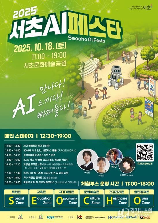 [경기뉴스원/경기뉴스1] | 서울 서초구는 ‘양재 AI 특구’ 지정 1주년을 기념해 오는 18일 서초문화예술공원에서 누구나 인공지능(AI)을 만나고, 느끼고, 빠져들 수 있는 ‘2025 서초 AI 페스타’를 개최한다고 밝혔다.