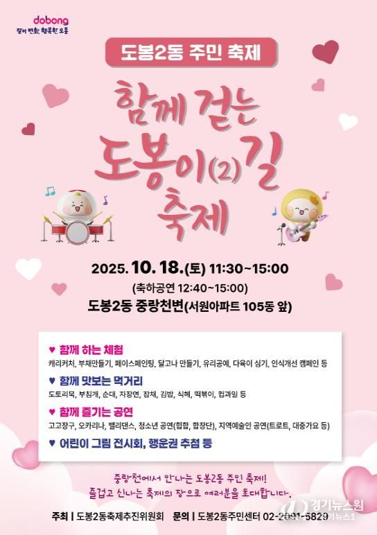 [경기뉴스원/경기뉴스1] | 서울 도봉구가 10월 18일 오전 11시 30분 중랑천변(서원아파트 105동 앞) 일대에서 ‘함께 걷는 도봉이(2)길’ 축제를 개최한다.