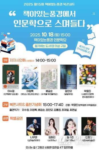 [경기뉴스원/경기뉴스1] | 고창군 작은도서관 ‘책이있는풍경’이 오는 18일 제15회 북콘서트 ‘책이있는풍경에서 인문학으로 스며들다’를 연다. 이번 행사는 문학과 음악이 어우러진 특별한 시간으로 지역민에게 책과 예술의 향기를 전할 예정이다.