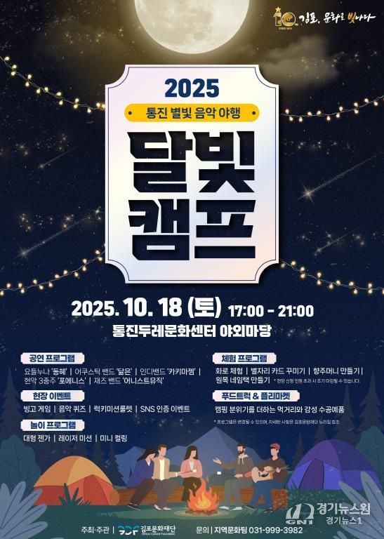 [경기뉴스원/경기뉴스1] | (재)김포문화재단이 주관하는 2025 통진별빛음악야행 '달빛캠프'가 10월 18일 17시부터 통진두레문화센터 야외마당에서 개최된다.