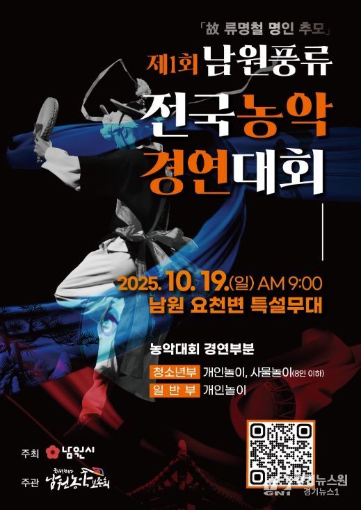 [경기뉴스원/경기뉴스1] | 고(故) 류명철 명인을 추모하고 남원농악의 전통을 전국적으로 확산하기 위한 ‘제1회 남원풍류 전국농악경연대회’가 오는 10월 19일, 남원시 요천변 특설무대에서 열린다.