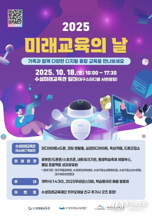 [경기뉴스원/경기뉴스1] | 수성미래교육재단)이 주최하고 수성미래교육관이 주관하는 ‘2025 미래교육의 날’ 행사가 오는 18일 수성미래교육관 일대 대구스타디움 서편광장에서 개최된다.