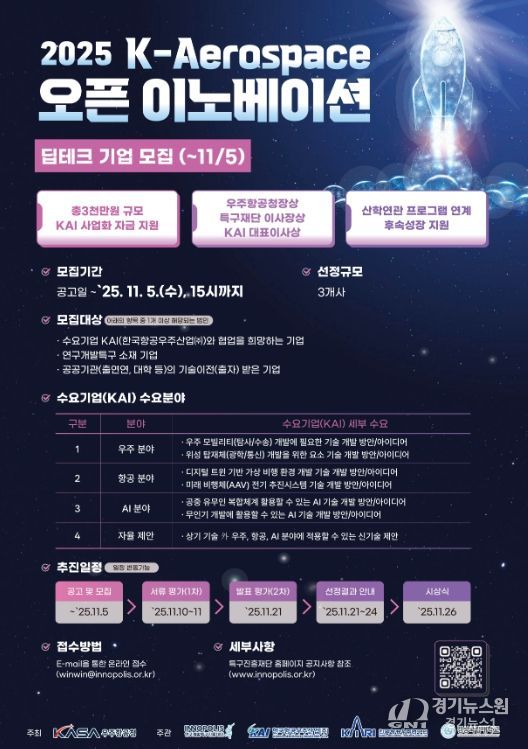 [경기뉴스원/경기뉴스1] | 경상국립대학교 경남진주강소특구지원센터는 한국항공우주산업㈜ 연구개발특구진흥재단, 한국항공우주연구원과 공동으로 ‘2025 K-항공우주(Aerospace) 오픈 이노베이션’을 추진한다.