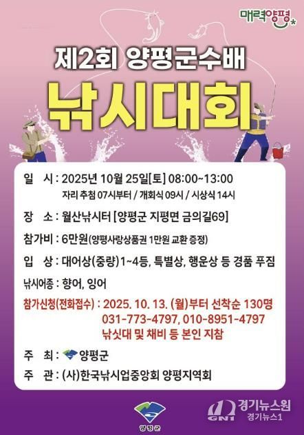 [경기뉴스원/경기뉴스1] | 양평군은 오는 25일 관내 월산낚시터에서 ‘제2회 양평군수배 낚시 대회’를 개최한다고 밝혔다.