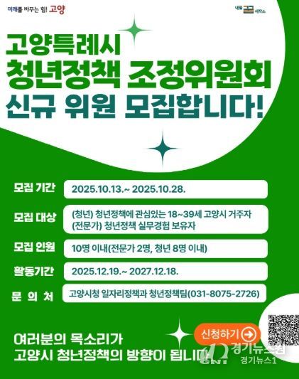 [경기뉴스원/경기뉴스1] | 고양특례시는 청년이 시정의 주체로 참여해 정책을 함께 만들어갈 수 있도록 고양시 청년정책조정위원회 청년 및 전문가 위원을 공개 모집한다고 밝혔다.