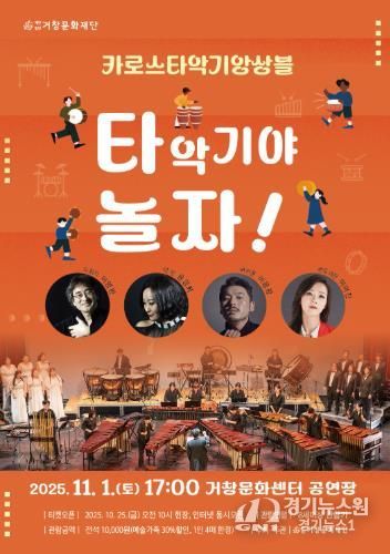 [경기뉴스원/경기뉴스1] | (재)거창문화재단은 오는 11월 1일 토요일 오후 5시 거창문화센터 공연장에서 카로스 타악기 앙상블과 함께하는'타악기야 놀자!'를 개최한다.