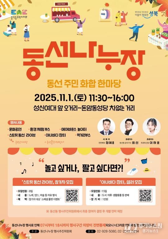[경기뉴스원/경기뉴스1] | 서울 성북구는 오는 11월 1일 오전 11시 30분부터 오후 4시까지, 성신여대 앞 오거리에서 돈암동성당 구간까지 이어지는 거리에서 ‘2025년 차 없는 거리 동선나누장’ 행사를 개최한다고 밝혔다.