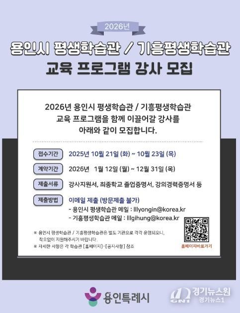 [경기뉴스원/경기뉴스1] | 용인특례시는 21일부터 23일까지 3일간 ‘2026년 평생학습관 프로그램’을 운영할 강사를 모집한다고 15일 밝혔다.