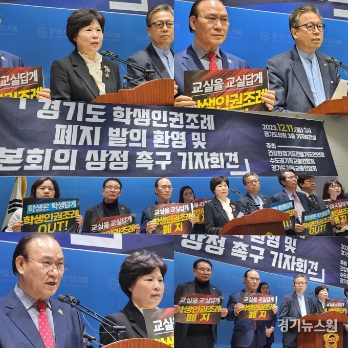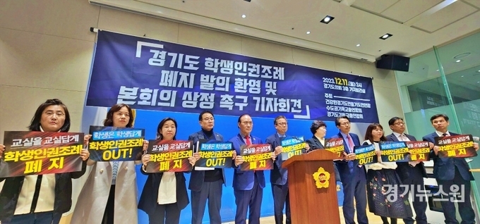 경기뉴스원 | 수도권기독교총연합회가 11일 경기도의회 기자회견실에서 경기도학생인권조례 폐지 발의 환영 및 본회의 상정 촉구 기자회견을 개최하고 있다.