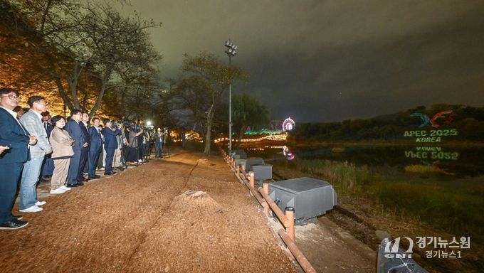 [경기뉴스원/경기뉴스1] | 경상북도와 경주시는 15일 저녁, 보문관광단지 육부촌과 호반 광장 일원에서 이철우 도지사, 주낙영 경주시장 등 주요 내빈과 시민 100여 명이 참석한 가운데, APEC 보문단지 야간경관 개선사업 '빛의 향연' 시연회를 개최했다.