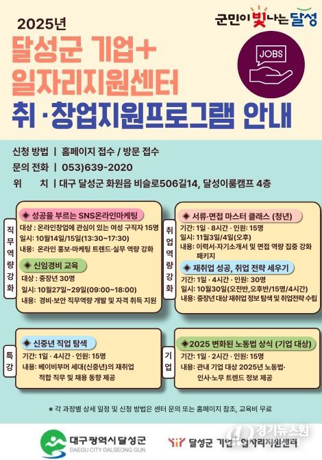 자세한 일정 확인 및 신청은 ‘달성군 기업+일자리지원센터’ 홈페이지 또는 전화로 가능하다.
