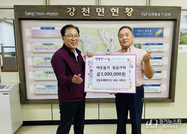 [경기뉴스원/경기뉴스1] | 성일우레탄㈜ 이민우 대표가 지난 15일 강천면 행정복지센터를 방문하여 관내 소외계층 복지사업을 위한 성금 300만원을 강천면에 기탁했다.