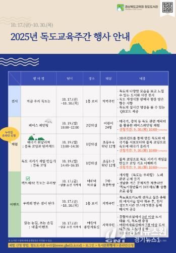 [경기뉴스원/경기뉴스1] | 경상북도교육청 청도도서관은 오는 10월 17일부터 30일까지 지역 주민을 대상으로 '2025년 독도교육주간 행사'를 운영한다.