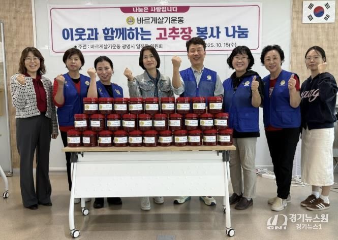 [경기뉴스원/경기뉴스1] | 광명시 일직동 바르게살기위원회는 지난 15일 관내 어려운 이웃을 돕기 위해 ‘이웃과 함께 하는 고추장 나눔 봉사’ 활동을 실시했다.