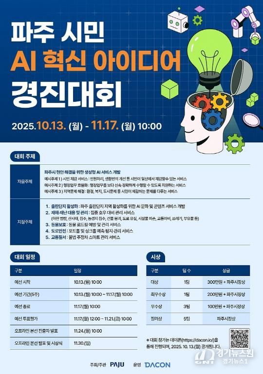 [경기뉴스원/경기뉴스1] | 파주시는 10월 13일부터 11월 17일까지 시민이 직접 참여하는 ‘파주 시민 인공지능(AI) 혁신 아이디어 경진대회’를 개최한다고 밝혔다.
