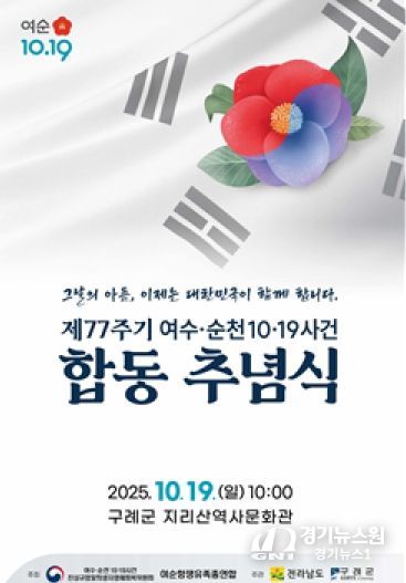 [경기뉴스원/경기뉴스1] | 전남 구례군은 여순사건의 역사적 의미를 되새기고 희생자와 유족들을 위로하기 위한‘여순사건 제77주기 정부주최 합동추념식’이 오는 19일 구례군 지리산역사문화관에서 개최된다고 밝혔다.