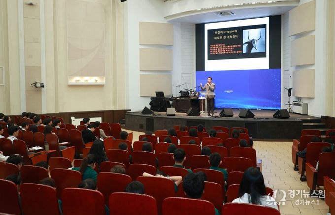 [경기뉴스원/경기뉴스1] | 이상일 용인특례시장이 17일 오후 기흥구 신갈동에 있는 새물결기독학교에서 학생들을 대상으로 ‘관찰하고 상상하며 새로운 길을 개척하라’는 주제로 약 한 시간에 걸쳐 특강을 했다.