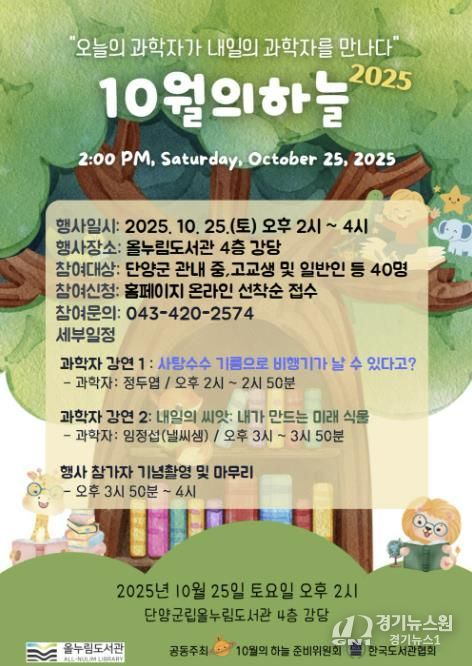 [경기뉴스원/경기뉴스1] | 충북 단양군립올누림도서관은 오는 25일 오후 2시부터 4시까지 과학자들의 재능기부로 진행되는 ‘10월의 하늘’ 과학 행사를 운영한다고 밝혔다.