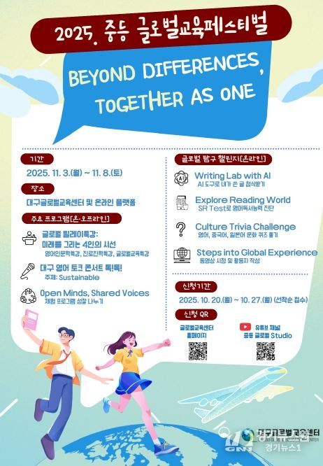 [경기뉴스원/경기뉴스1] | 대구교육연수원 산하 대구글로벌교육센터는 11월 3일부터 8일까지 ‘Beyond Differences, Together as One(차이를 넘어, 하나로)’을 주제로 '2025 중등 글로벌교육페스티벌'을 개최한다.