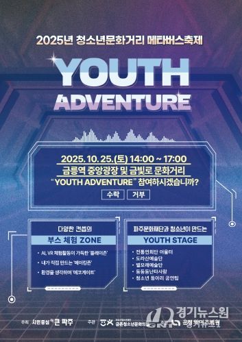 [경기뉴스원/경기뉴스1] | (재)파주시청소년재단 금촌청소년문화의집은 오는 2025년 10월 25일 토요일 금릉역 중앙광 및 금빛로 문화거리 일대에서 2025년 청소년문화거리메타버스축제 ‘YOUTH ADVENTURE’를 개최한다고 밝혔다.