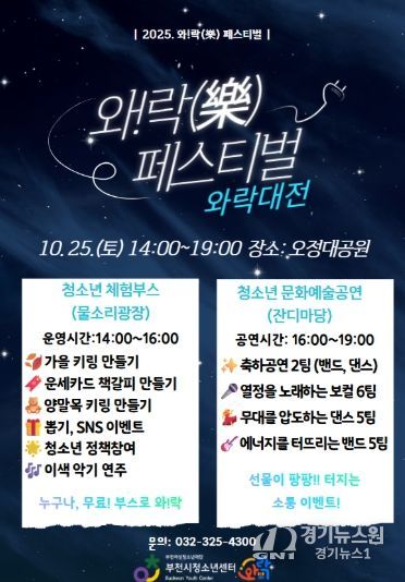 [경기뉴스원/경기뉴스1] | 부천여성청소년재단이 운영하는 부천시청소년센터는 오는 10월 25일 오후 2시, 부천 오정대공원에서 와!락(樂) 페스티벌 ‘와락대전’을 진행한다고 밝혔다.