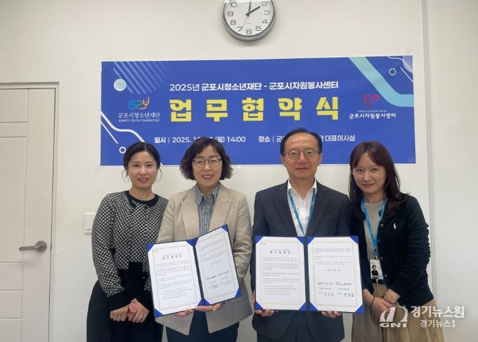 [경기뉴스원/경기뉴스1] | 군포시청소년재단은 10월 20일 군포시청소년재단 대표이사실에서 군포시자원봉사센터와 지역사회 상생 및 자원봉사 활성화를 위한 업무협약을 체결했다.