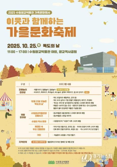 [경기뉴스원/경기뉴스1] | 수원광교박물관은 독도의 날인 10월 25일 오전 11시부터 오후 5시까지 수원광교박물관 야외(광교역사공원)에서 ‘2025 수원광교박물관 가족문화행사–이웃과 함께하는 가을문화축제’를 연다.