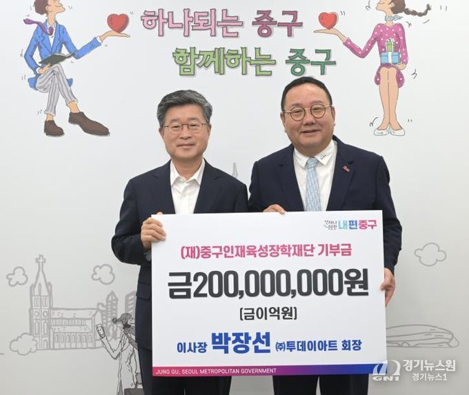 [경기뉴스원/경기뉴스1] | 서울 중구는 ㈜투데이아트 박장선 회장이 서울중구인재육성장학재단에 지역 인재 육성을 위한 장학금 2억원을 기탁했다고 22일 밝혔다. 전달식은 지난 21일 중구청장실에서 열렸다.