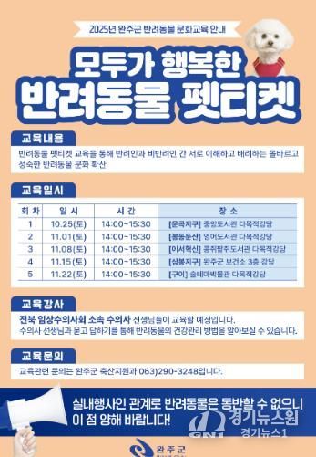[경기뉴스원/경기뉴스1] | 완주군이 성숙한 반려문화 정착과 동물복지 향상을 위해 ‘모두가 행복한 반려동물 펫티켓’ 문화교육을 실시한다.