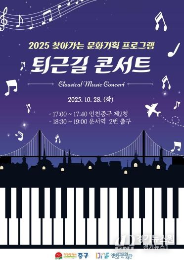 [경기뉴스원/경기뉴스1] | (재)인천중구문화재단(이사장 김정헌)은 오는 28일 저녁 퇴근길 시민들을 위한 특별한 문화 행사 ‘2025 영종 퇴근길 콘서트’를 개최한다.