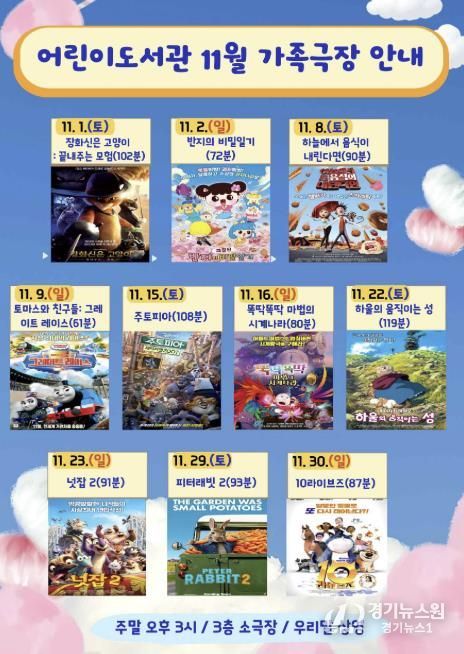 이번 11월 상영될 가족영화는 어린이와 가족 이용자들이 함께 웃고 공감할 수 있는 애니메이션 중심의 프로그램으로 구성됐으며, 관람료는 무료이다.