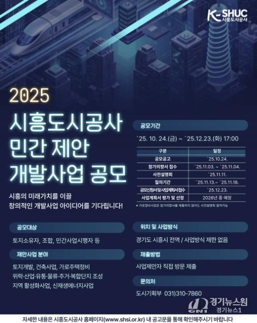 [경기뉴스원/경기뉴스1] | 시흥도시공사는 민간의 창의적인 개발 아이디어와 공사의 개발사업 역량을 결합하여, 신규 개발사업을 발굴하기 위한 ‘민간 제안 개발사업 공모’를 추진한다고 24일 밝혔다.