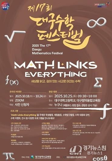 [경기뉴스원/경기뉴스1] | 대구시교육청이 주최하고 대구중등수학교육연구회가 운영하는 ‘제17회 대구수학페스티벌’이 10월 25일 9시 30분부터 대구과학고 및 대구창의융합교육원에서 'Math Links Everything(수학은 모든 것을 연결한다)'이라는 주제로 개최된다.
