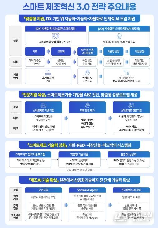 이에, 중기부는 제조기업과 기술기업 간의 선순환적인 스마트제조 생태계를 조성하여 국내 제조업의 근간인 중소 제조기업이 경쟁력을 확보할 수 있도록 'AI 기반 스마트제조혁신 3.0 전략'을 발표했다.
