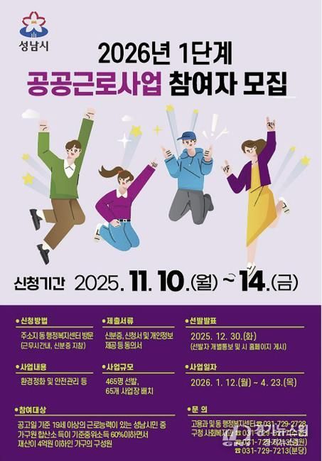 한편, 성남시는 2026년도 공공근로사업에 총 70억8200만원을 투입해 저소득층과 취업취약계층에 한시적 일자리를 제공한다.