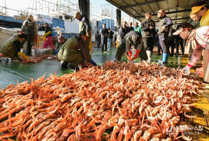 [경기뉴스원/경기뉴스1] | 겨울철 최고의 수산물로 꼽히는 영덕대게가 5개월간의 금어기를 마치고 지난 3일 강구항 위판장에서 올해 처음으로 위판됐다.