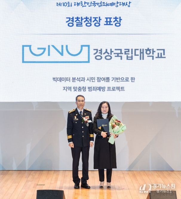 [경기뉴스원/경기뉴스1] | 경상국립대학교 라이즈(RISE) 사업단 지역교육혁신센터(센터장 김영순 정보통계학과 교수)가 ‘제10회 대한민국 범죄예방대상’에서 경찰청장 표창을 수상했다. 전국 대학 가운데 유일한 수상 기관이다.