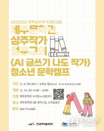 [경기뉴스원/경기뉴스1] | 제주문학관이 한국문화예술위원회 '2025년 문학상주작가 지원사업'의 일환으로 상주작가 정훈교의 '인공지능(AI) 글쓰기 나도 작가' 청소년 문학캠프를 개최한다.