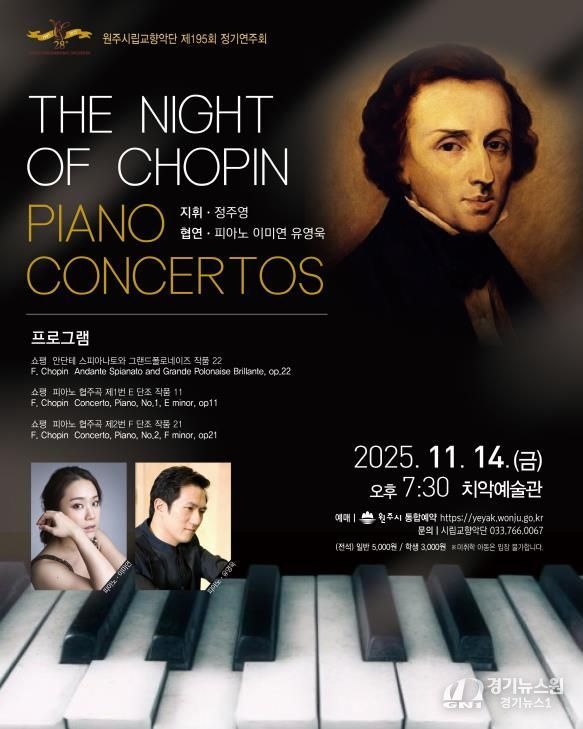 [경기뉴스원/경기뉴스1] | 원주시립교향악단은 오는 14일 오후 7시 30분, 치악예술관에서 제195회 정기연주회 ‘The Night of CHOPIN’을 개최한다.