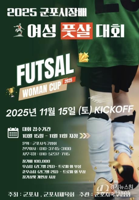 [경기뉴스원/경기뉴스1] | 군포시는 여성 생활체육 참여 확대와 건전한 스포츠 문화 확산을 위해 ‘2025 군포시장배 여성 풋살대회’를 오는 11월 15일(토) 군포시 국민체육센터 축구장에서 개최한다.