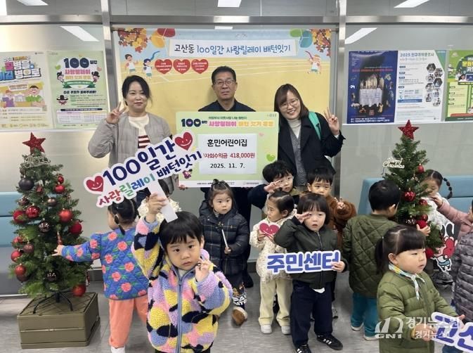 [경기뉴스원/경기뉴스1] | 의정부시 고산동주민센터는 11월 7일 훈민어린이집이 바자회를 통해 모은 수익금 40여만 원을 기탁하며 ‘100일간 사랑릴레이 배턴 잇기’에 동참했다고 밝혔다.