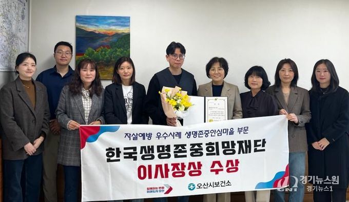 [경기뉴스원/경기뉴스1] | 오산시는 정신건강복지센터가 추진한 ‘생명존중안심마을’ 사업이 자살예방사업 우수사례로 선정되어, 한국생명존중희망재단 이사장상을 수상했다고 21일 밝혔다.