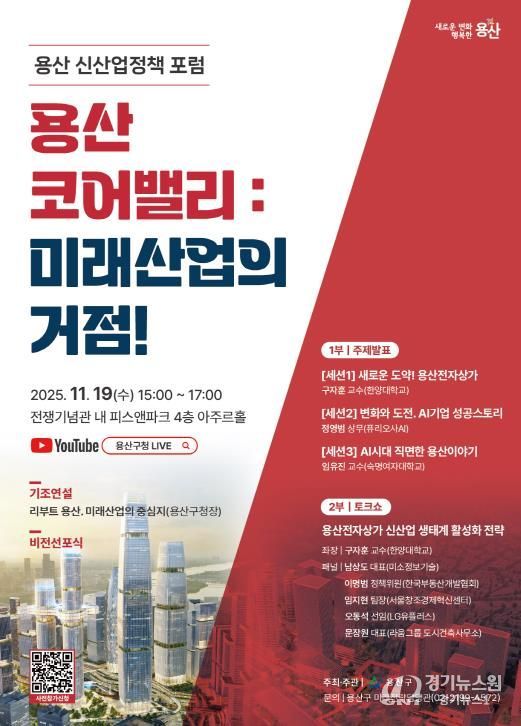 [경기뉴스원/경기뉴스1] | 서울 용산구가 AI(인공지능)·ICT(정보통신기술) 산업 중심지로의 도약을 선언했다. 구는 오는 11월 19일 전쟁기념관 피스앤파크 아주르홀에서 ‘용산 코어밸리, 미래산업의 거점’을 주제로 ‘용산 신산업정책 포럼’을 연다고 11일 밝혔다.