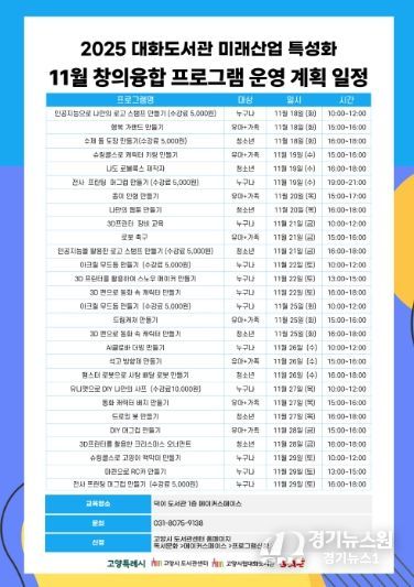 [경기뉴스원/경기뉴스1] | 고양특례시 대화도서관은 덕이도서관 1층 메이커스페이스(이전 공간)에서 초등학생부터 성인을 대상으로 11월 ‘미래산업 특성화 창의융합 프로그램’을 운영한다고 밝혔다.