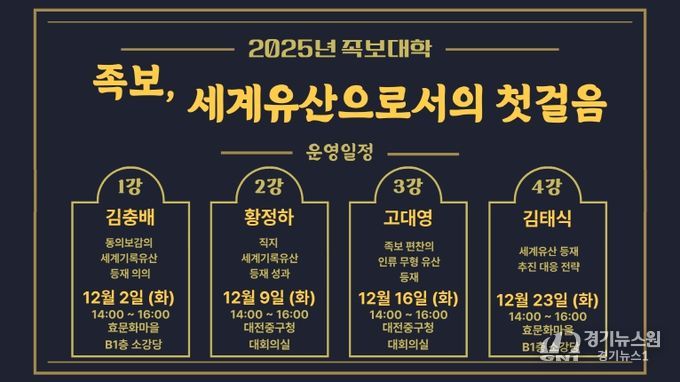 [경기뉴스원/경기뉴스1] | 대전 중구는 오는 12월 2일부터 23일까지 매주 화요일, 총 4회에 걸쳐 2025 족보대학 ‘족보, 세계유산으로서의 첫 걸음’프로그램을 운영한다고 밝혔다.