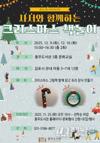 [경기뉴스원/경기뉴스1] | 김포시 풍무도서관은 ‘사서와 함께하는 크리스마스 책놀이’프로그램을 12월 9일과 16일 오후 3시부터 4시 30분까지 운영한다.