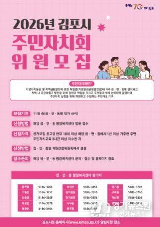 [경기뉴스원/경기뉴스1] | 김포시는 2025년 주민자치회 3기 임기 종료를 앞두고 ‘주민이 만드는 실질적 주민자치’를 실현하기 위한 4기 주민자치회 위원을 공개모집한다고 밝혔다.