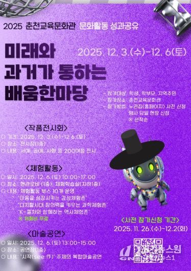 [경기뉴스원/경기뉴스1] | 춘천교육문화관은 12월 3일부터 12월 6일까지 ‘미래와 과거가 통하는 배움한마당’이라는 주제로 문화활동 성과공유 행사를 운영한다.