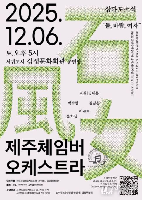 [경기뉴스원/경기뉴스1] | 서귀포시는 2025년 공연장 상주단체 육성지원 사업의 일환으로, 제주체임버오케스트라의 '삼다도 소식'을 12월 6일 오후 5시에 김정문화회관 공연장에서 개최한다고 밝혔다.