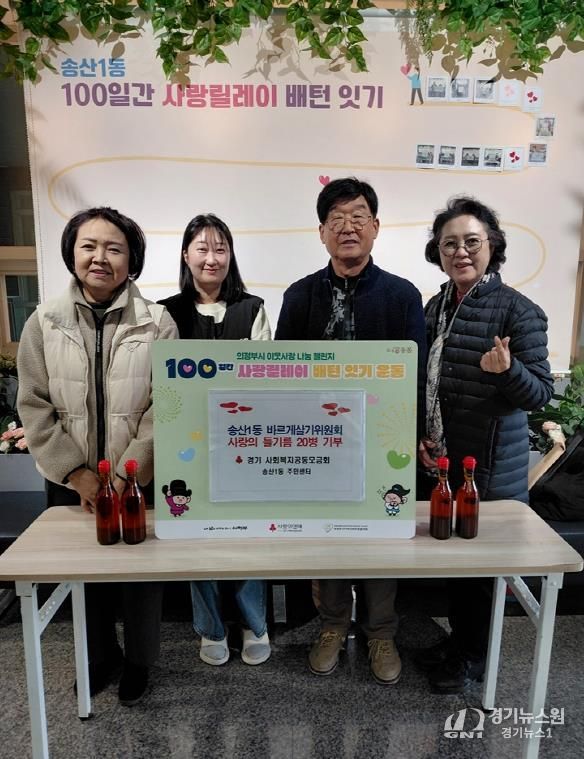 [경기뉴스원/경기뉴스1] | 의정부시 송산1동주민센터는 11월 19일 송산1동 바르게살기위원회가 직접 만든 들기름 20병을 기부하며 ‘100일간 사랑릴레이 배턴 잇기’에 동참했다고 밝혔다.
